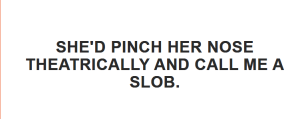 If my room was untidy, she’d pinch her nose theatrically and call me a slob. If I walked through the house with my earbuds in, she’d call me a rude brat.