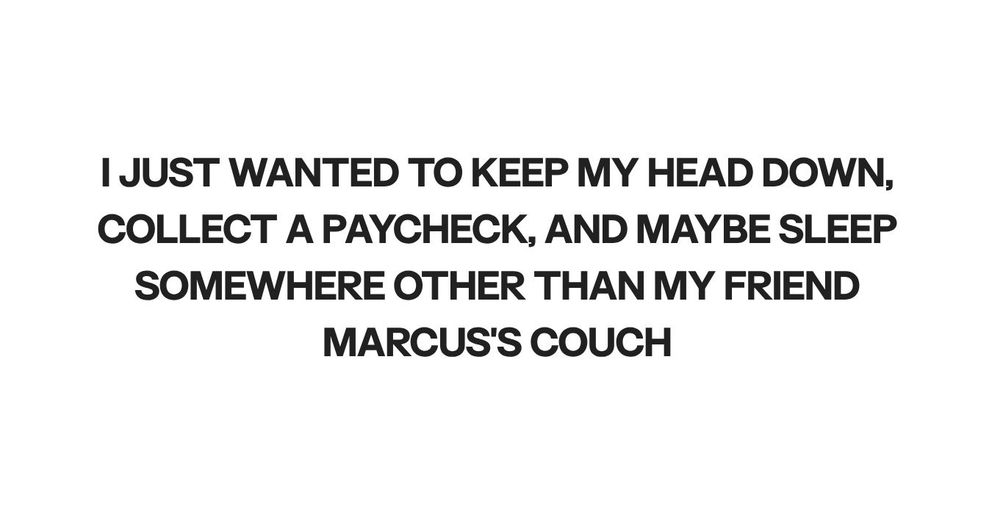 I just wanted to keep my head down, collect a paycheck, and maybe sleep somewhere other than my friend Marcus’s couch before my back gave out completely.