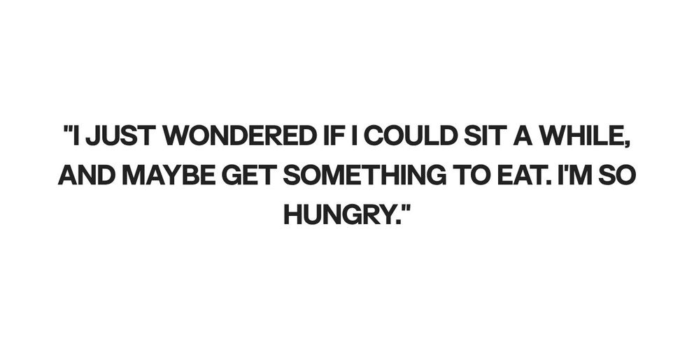 “Sorry, sweetheart,” she said softly. “I was wondering if I could sit for a bit. And maybe get something to eat. I’m very hungry.”