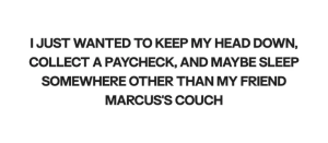 “Look, man… I’ve got your back. You know that.” He sat in the armchair. “It sucks you got fired, but the plan all along was to work there until you landed something in your field, right?”