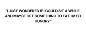 “Sorry, sweetheart,” she murmured. “I just wondered if I could sit a while, and maybe get something to eat. I’m so hungry.”