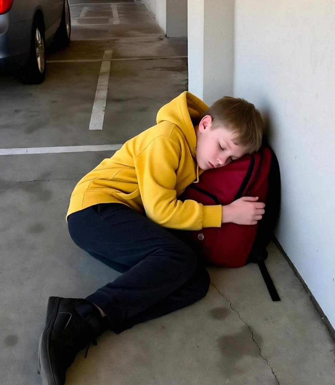 I had a bad cold and drove to the grocery store for cough syrup. The parking garage was dim and nearly empty. As I walked, I noticed a shape behind a pillar.