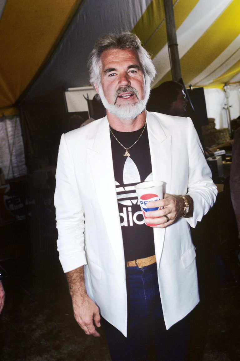 Throughout the 1980s, Rogers’ appearance remained refined and consistent. His hair stayed full and white, his beard neatly trimmed, and his facial features appeared well-maintained as he balanced approachability with larger-than-life stardom.