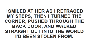I smiled, retraced my steps, turned the corner, pushed through the back door, and walked straight out into the world that had been stolen from me.