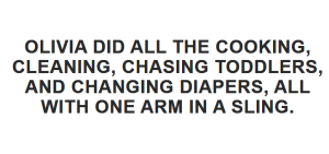Olivia did all the cooking, cleaning, chasing toddlers, and changing diapers, all with one arm in a sling.